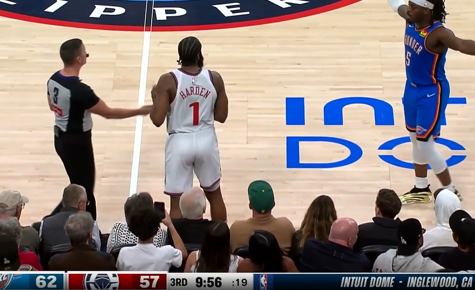 被多特贴身顶翻!哈登捂着自己的大腿痛苦倒地!好在无碍继续比赛