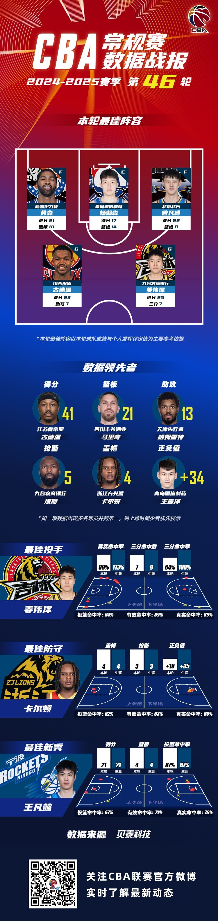 2024-2025赛季CBA联赛常规赛第46轮结束较量,来自新疆广汇篮球俱乐部的劳森,青岛国信海天篮球俱乐部的杨瀚森,北京首钢篮球俱乐的曾凡博,山西汾酒职业篮球俱乐部的古德温和吉林东北虎男篮的姜伟泽入选CBA联赛常规赛第46轮最佳阵容!