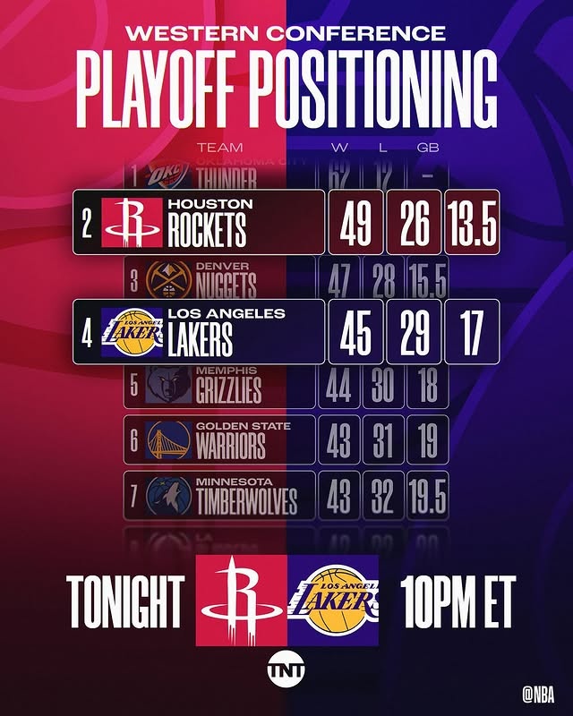 目前火箭49胜26负西部第二,湖人45胜29负西部第四。